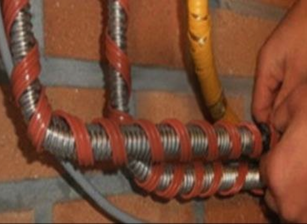 안전한 방법은 균일한 10cm 간격 나선형 권취 후, 글라스울이나 암면 같은 난연 보강재만 적용하는 것이다.